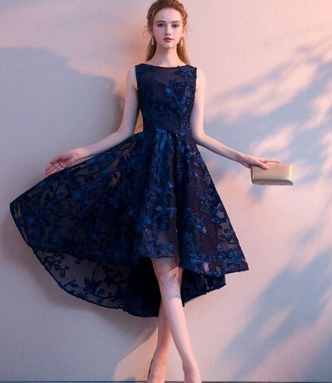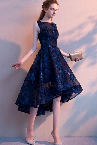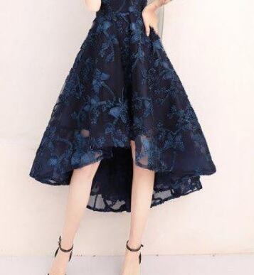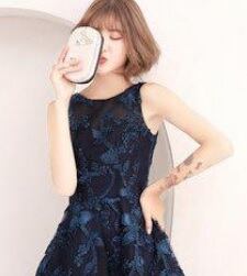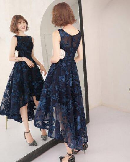 ネットチュールのフィッシュテ-ルミディアムドレスです。ネイビーカラーのネットチュールの下地に光沢のあるネイビーのリボンを立体刺繍の様にあしらったとてもエレガントなドレスです。前と後の丈が異なるフィッシュテ-ルです。裏地付き。背中ファスナ-有。胸パット付き。