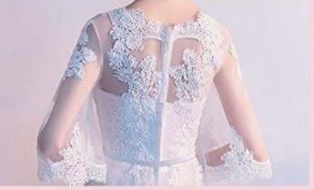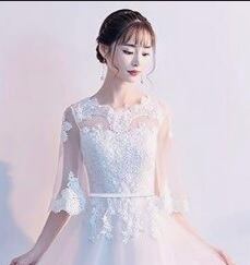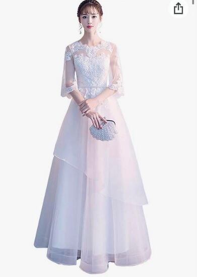 刺繍飾りのプリンセスウエディングドレス。トップス部分には立体的な刺繍をほどこしてピュアで清楚な雰囲気に。袖は透け感のあるチュールをたっぷりと使用し、ふんわりと二の腕をおおいカバーしてくれています。胸元からウエスト下にかけて綺麗なAラインに広がり豪華かつエレガントな雰囲気を醸し出しています。ウエディングドレスとしても、また、パーティやイベント、結婚式など、様々なシーンで、気品のある印象を与えてくれる一枚です。裏地なし。(裏地にしっかりとしたサテン地を使用しているので透け感はありません)背中ファスナ-有。胸パット付。パニエは付いておりません。