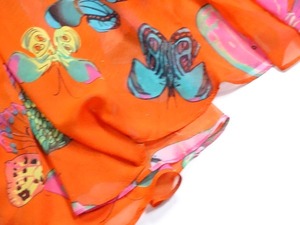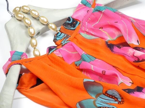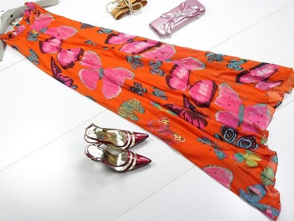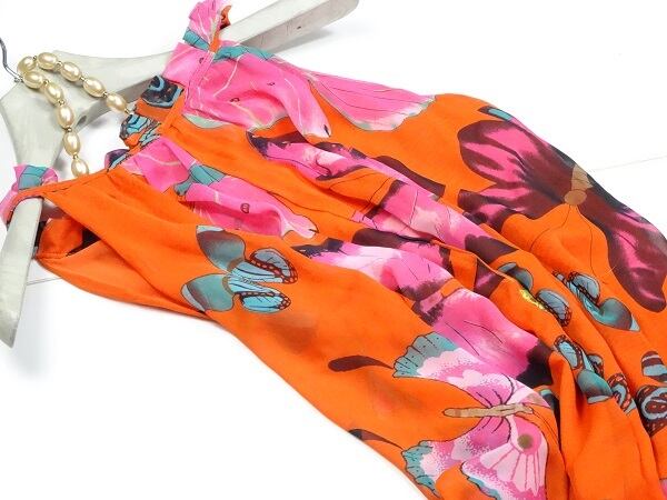 カラフルなバタフライが大胆にプリントされたマキシ丈のワンピ-スです。色や大きさの異なるバタフライがたくさんプリントされていてインパクト十分です。ウエストメイクすればメリハリボディ-でさらに女性度UPです。裏地有。ベルト付。ファスナ-なし(かぶるタイプ)
