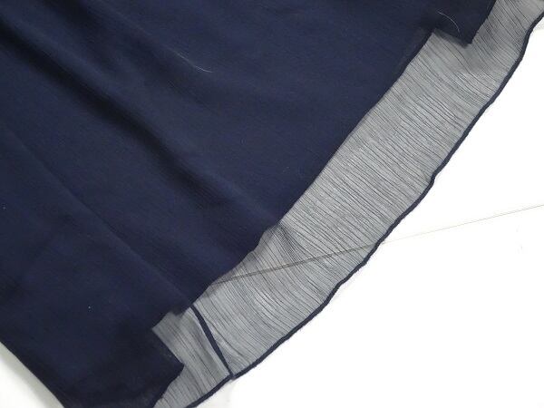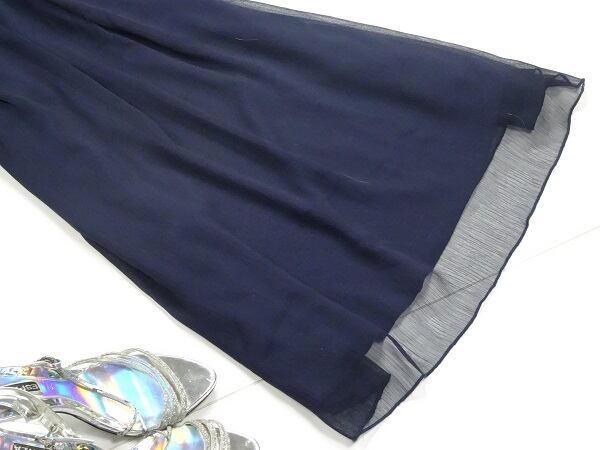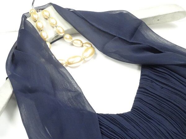 シフォンの柔らかい雰囲気のネイビ-ワンピースです。スカ-フをまとうと優雅さを持った大人の雰囲気を醸し出してくれるシルエットになっています。裏地付。スカ-フ付。