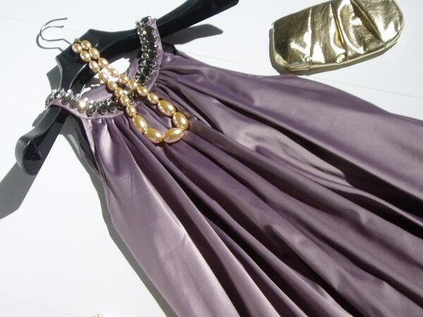 胸元に大きなビジューがあしらわれたフレアワンピース。艶やかなサテン地をたっぷりと使用し、ボリューム感のあるシルエットが綺麗で胸元のビジューが華やかさを演出しています。後襟ボタン一つ留め。ボタンから下に10cmほどのスリットが入っていますので着脱がしやすいデザイン。裾のチュールも足元を美しく魅せてくれます。ファスナーなし。裏地付。
