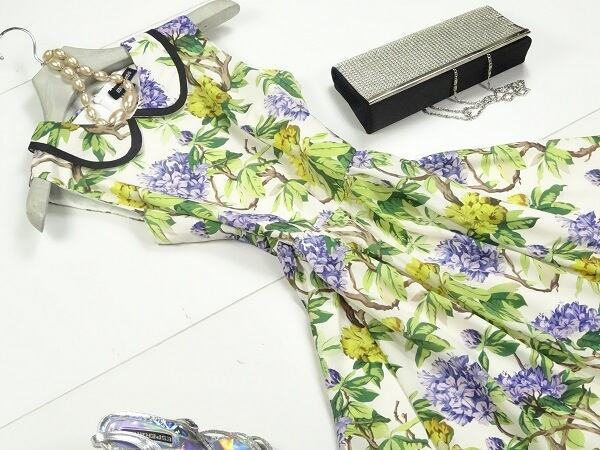 大きな丸襟が目をひくキュートなワンピース。全体にシックな色合いのボタニカルプリントがほどこされ、丸襟の黒の縁取りが全体の印象をきりっと引き締めています。品の良さと可愛らしさをミックスした印象の魅力的な一着です。背中ファスナー。裏地付。