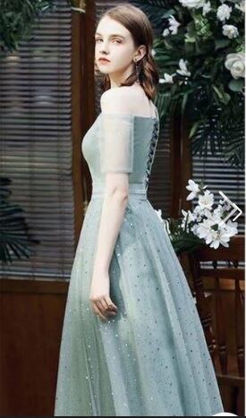 ワンショルダー星プリントのチュールドレス。落ち着いたスモーキーグリーンのサテン地にやわらかなチュールを2枚重ねしたデザイン性のあるスタイルがとても魅力的。肩はワンショルダーで、肩のある右側はチュールの袖が離れて脇から付いており、肩のない左側は右と同じ位置にチュールの袖がつき二の腕を優しくカバーしてくれています。ウエストには白のネットチュール地の上にビーズを重ねたウエスト飾りをあしらっており、豪華かつ上品で全体的に優しい感じに仕上がっています。結婚式、パーティ、コンサートにと、華やかなシーンに最適な一着です。背中編紐リボンと腰下ファスナ-有。裏地なし。胸パット付き。