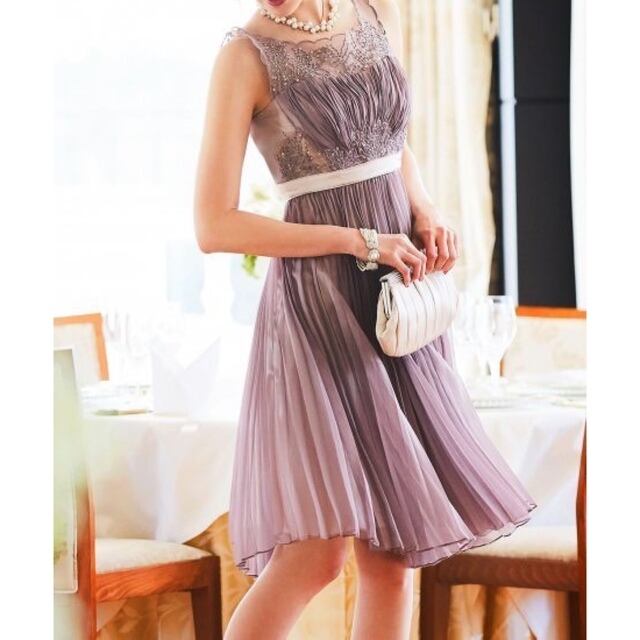 ビーズ飾りシルクプリーツのワンピース。胸元、ウエスト周りにビーズとスパコールをあしらった華やか一着。トップスは縦に細かなタックをとり、ウエストから裾へかけてたっぷりとったシルクシフォンのプリーツがエレガントで優しい印象を与えてくれます。デート、お呼ばれ、パーティ、コンサート、結婚式にと、さまざまなシーンに活躍してくれます。後ネックボタン1個留め。背中ファスナー。裏地あり。