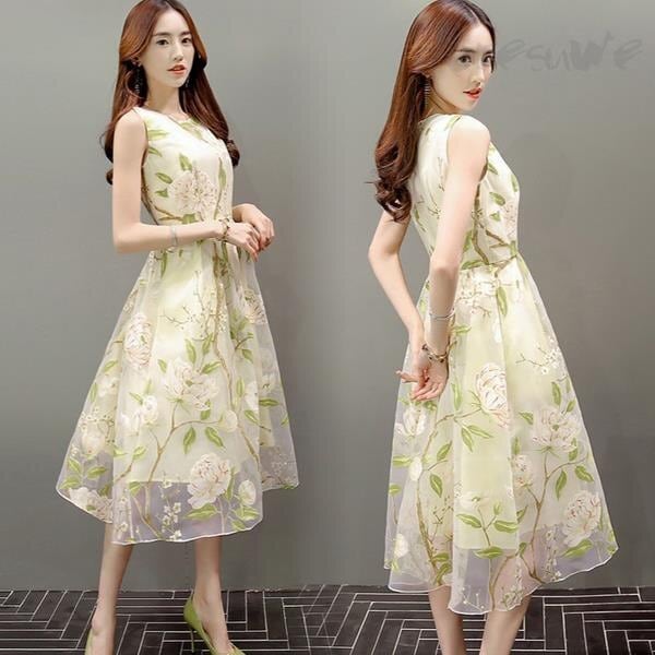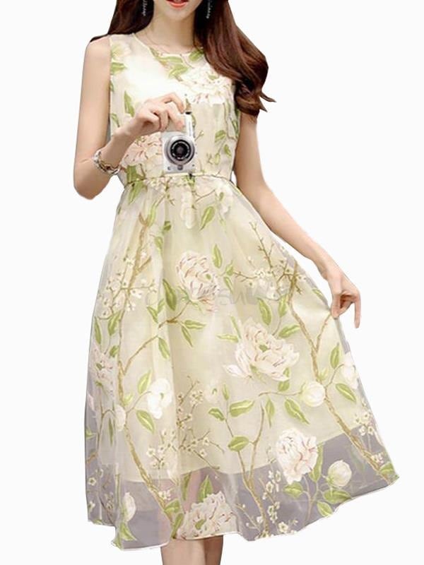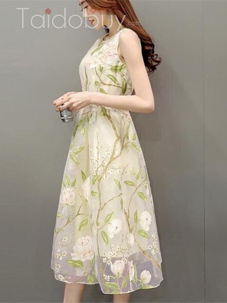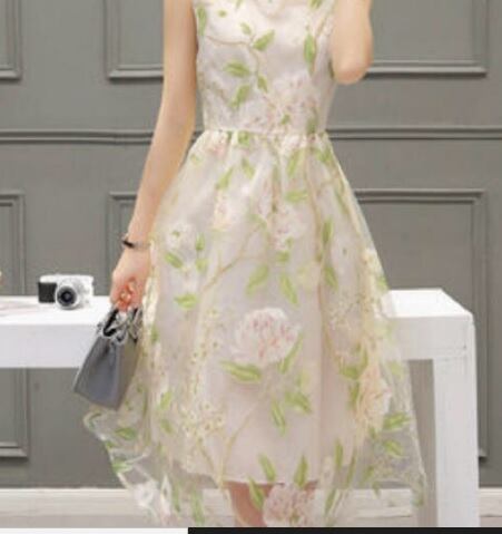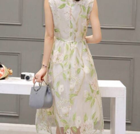 花模様のレース仕立ての膝丈ノ-スリ-ブワンピース。白の下地の上に、花模様をプリントしたレースをかぶせていて、薄い透け感がやわらかな印象を与えてくれています。大きなラウンドネックにノースリーブも全体の中でバランスが良く、ピュアでフェアリーなデザインになっています。煌めく太陽の光の中でも、また新緑の爽やかな風の中でも、着る人を美しく魅せてくれる一着です。裏地有り。背中ファスナー有。