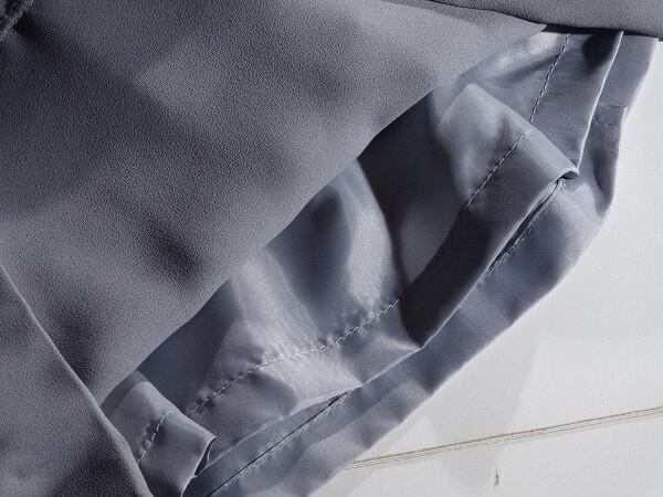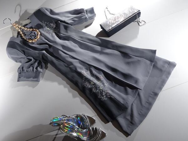 両サイドは濃いグレ-になっていて花模様がとても素敵かつ上品です。シックな中に大人の女性を演出してくれエレガントな印象をプラスしているデザイン。フォーマルからカジュアルまで、様々なシーンで活躍してくれる一着です。胸元のブローチは取り外し可。背中ファスナー。裏地あり。日本製。