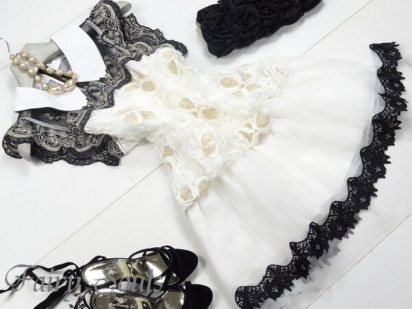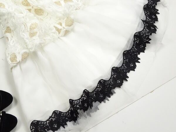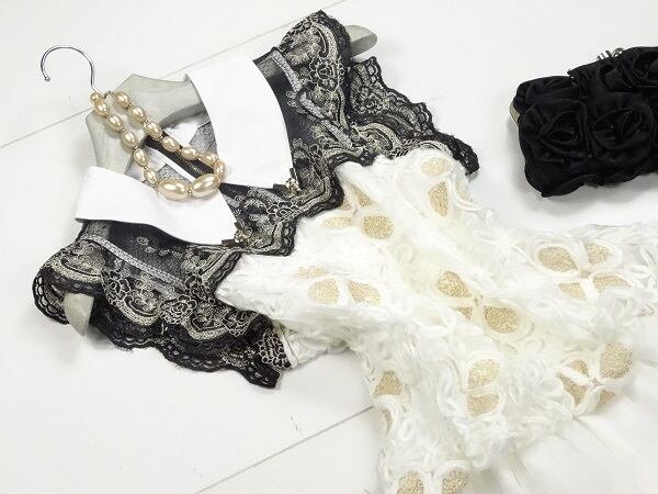 豪華な刺繍やレ-スとシンプルな襟が上品で優雅な女性に変身させます。シックな中にもキュートさをあわせもった、お呼ばれ、デート、結婚式の二次会、コンサート等、どんなシーンでも活躍してくれる貴重な一着です。首の後ろ部分のみファスナー有。裏地あり。