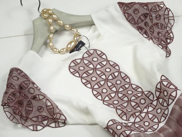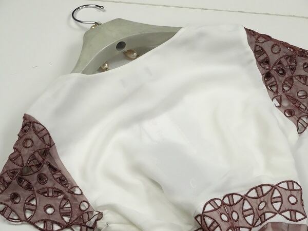 白と茶系の色のバランスがとても上品です。下地に刺繍された上にシルク地を重ねその刺繍模様の透け感がとても素晴らしいワンピ-スです。着心地もとても良くとっても可愛いです。裏地有。左サイドファスナ-有。