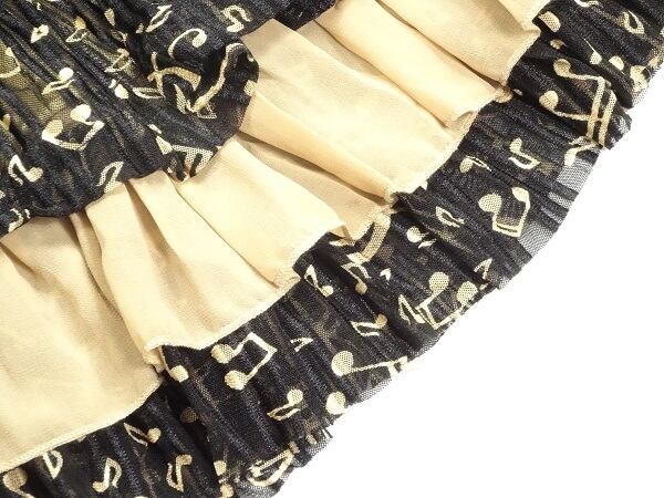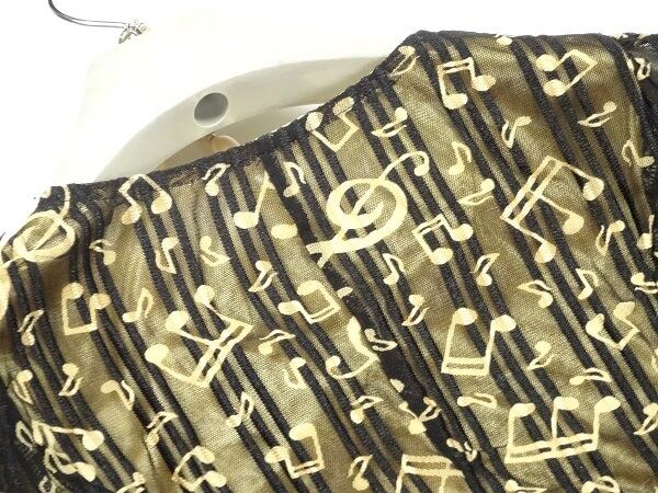 繊細な音符が編みこまれたレースのミニドレス。ゴールドの下地に黒のレ-スを重ね浮き立って華やかさを演出しています。シックで可愛いデザイン。結婚式の二次会や、ライブ、パーティなど様々なシーンで活躍してくれる一着です。裏地あり。