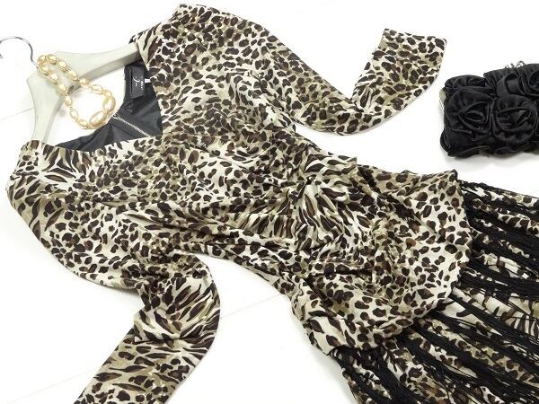 レオパ-ド柄の色使いがとてもオシャレで、しぐさを優雅に見せてくれる贅沢なお洋服です。情熱的な大人の女性を表現してくれるお洋服をこれからの季節にいかがでしょうか!。裏地有。背中ファスナ-有。