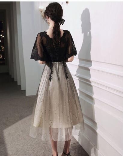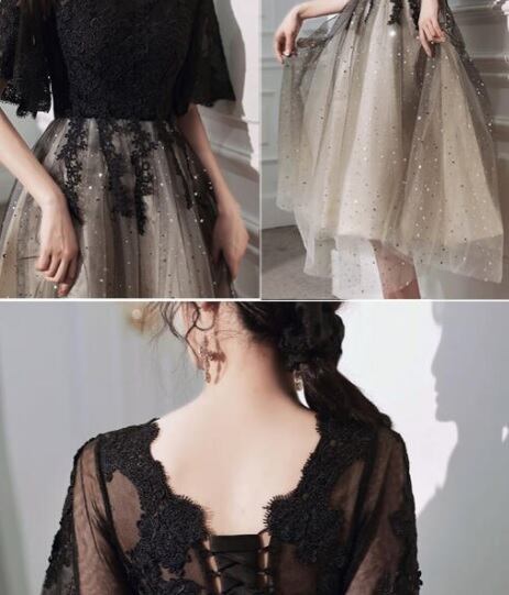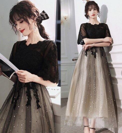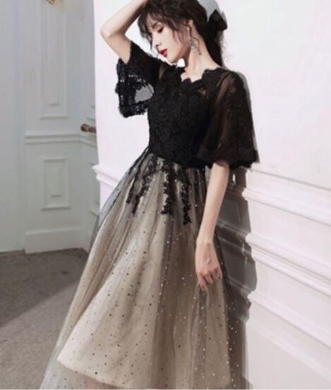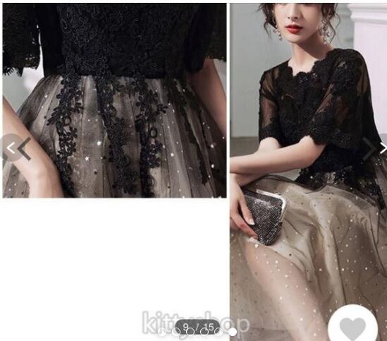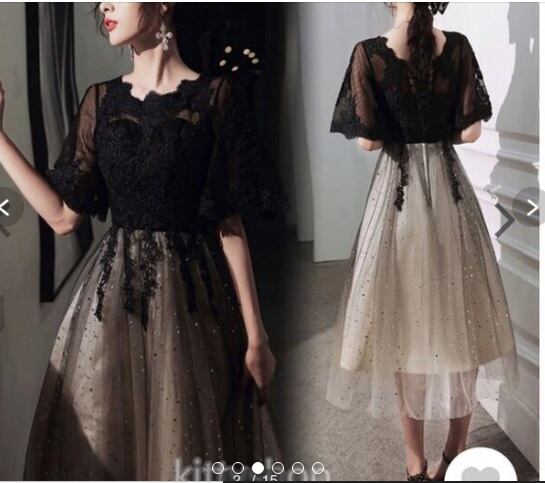 チュールと立体刺繍が施されたレースのシックなドレスです。白のサテン地の上に2枚のチュールをかぶせ、上半身と袖はレース仕様になっています。スカ-ト部分は黒のチュ-ルにシルバ-の星や三日月のビジュ-が施されシックで品があり華やかな、コンサート、ライブ、結婚式の二次会、パーティにとどんなシーンにも活躍してくれる一着です。裏地あり。背中網掛け。腰下ファスナ-有。胸パット付き。