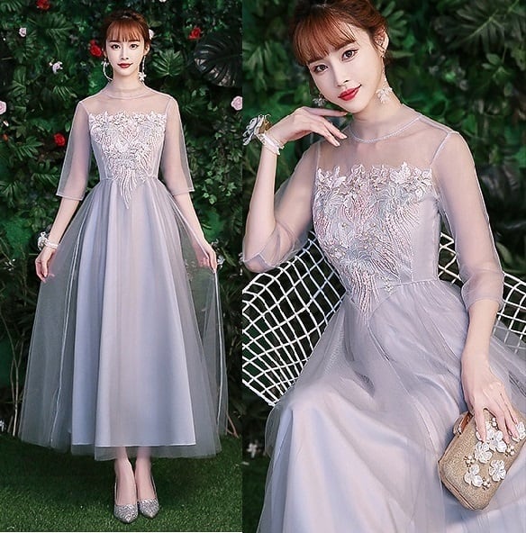 胸元刺繍とパール飾りのカラ-ドレス。胸元はピンクとシルバーの糸で立体刺繍したチュール地に小さなピンクのフェイクパ-ル飾りが施されキュートな印象に。ウエストからスカート裾までは、光沢のあるシルバーグレーのサテン地の上にしなやかなチュールを重ねとても豪華。首から胸元、袖にかけての透け感のあるチュールがデコルテラインを美しく見せてくれています。パーティやライブ、イベント、結婚式など、どんなシーンでも活躍してくれる一着です。裏地有。背中編み紐掛け。腰下ファスナー有。胸パット付き。