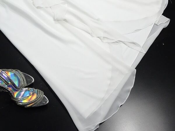 胸から腰までのドレ-プがとても綺麗なホルダ-ネックドレスです。腰から裾に向けて左サイドがフリルになってとてもオシャレです。大人の女性を醸し出してくれる一着です。裏地あり。サイドファスナ-有。