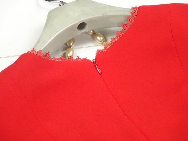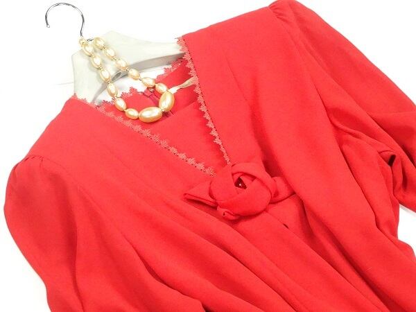レトロデザインの豪華なワンピ-スです。胸元のコサ-ジュがアクセントになっています。パーティなどフォーマルなシーンにもぴったりな一着です。背中ファスナー。裏地有り。日本製。