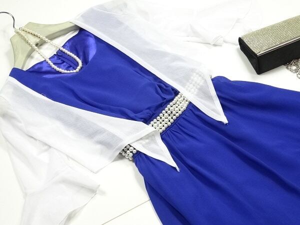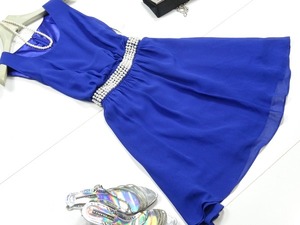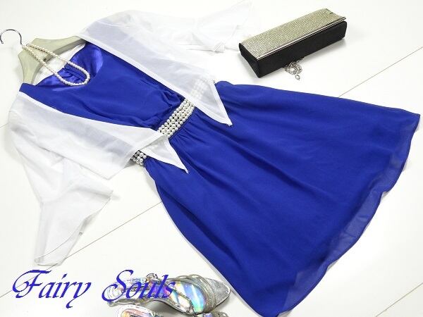 ボレロ付きシフォンのワンピース。綺麗な青のシフォンを使用したノースリーブワンピース。前側のウエストにはフェイクパールをあしらいアクセントに。後側のウエストは同じ青のシフォンのリボンで結ぶデザインになっています。白の軽いボレロが付いているのでクーラーの効いた室内でも大丈夫。Aラインシルエットが、女性らしい大人の雰囲気を醸し出してくれます。パーティやイベントなど、どんなシーンにも活躍してくれます。背中ファスナー。裏地つき。ウエストのリボンは取り外し不可。