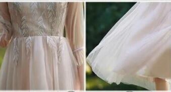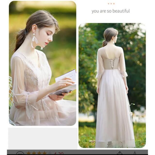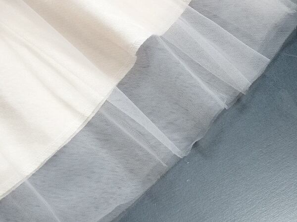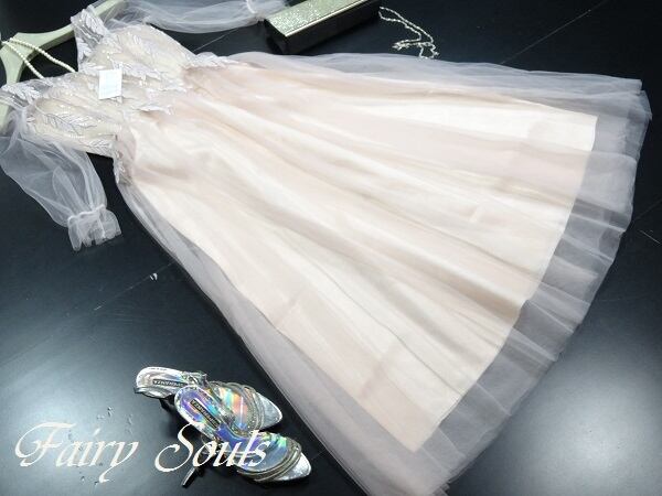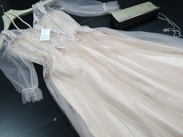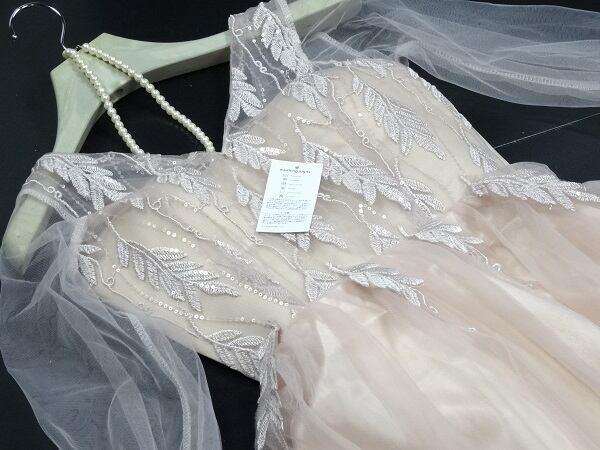 チュールロング丈のパーティードレス。やさしいスモーキーピンクのサテン地の上に、同色のチュール重ねた優しい印象のドレス。上半身には同色の糸でボタニカル柄を刺繍。袖はチュールのみで肌をほんのり見せ、袖先をゴムをしぼることで可愛らしさがアップ。裾までは2重のチュールをたっぷりと使用しボリューム感を出しています。背中は腰まで編み紐掛けになっているのでサイズ的にもゆとりをもって着用いただけます。フェミニンな中にも大人の魅力を感じさせてくれています。パーティやイベント、結婚式など、様々なシーンで、気品のある印象を与えてくれる一枚です。背中ファスナ-有。裏地なし。胸パット付き。