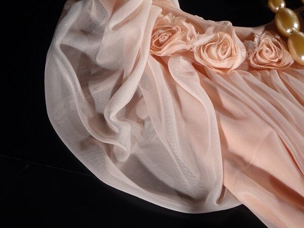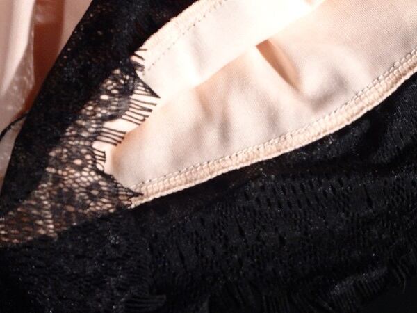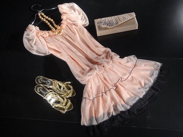 可愛らしいティア-ドスカ-トのワンピ-スです。落ち着いたサ-モンピンクに裾から覗く黒のレ-スがとても素敵です。裏地付。