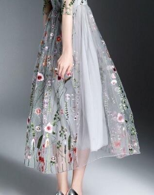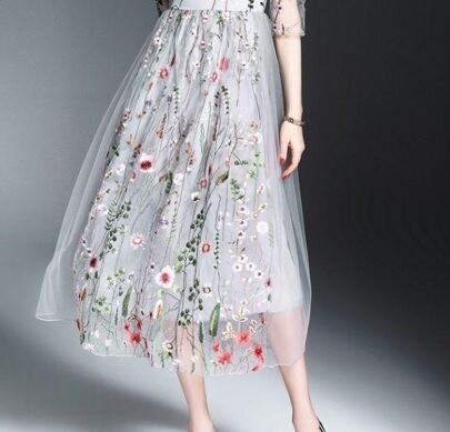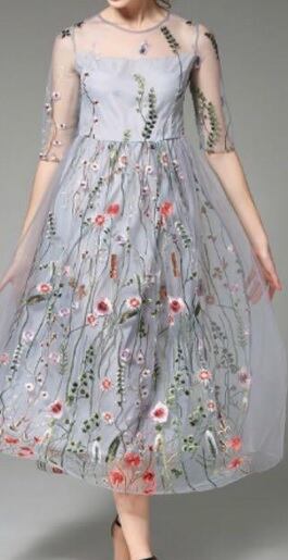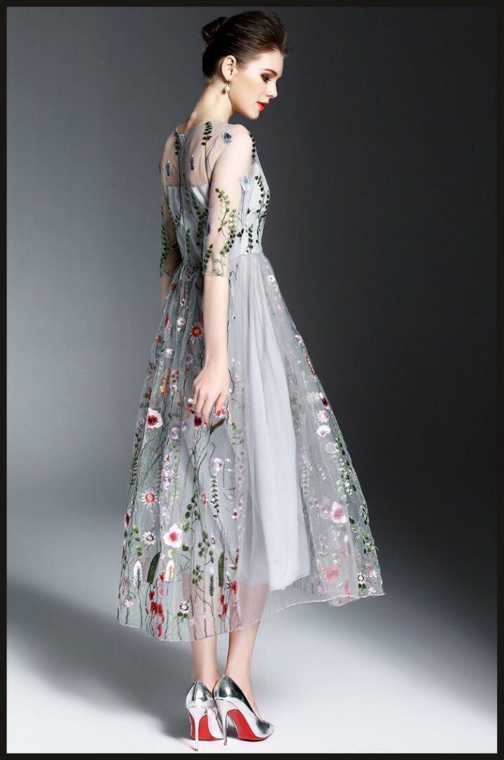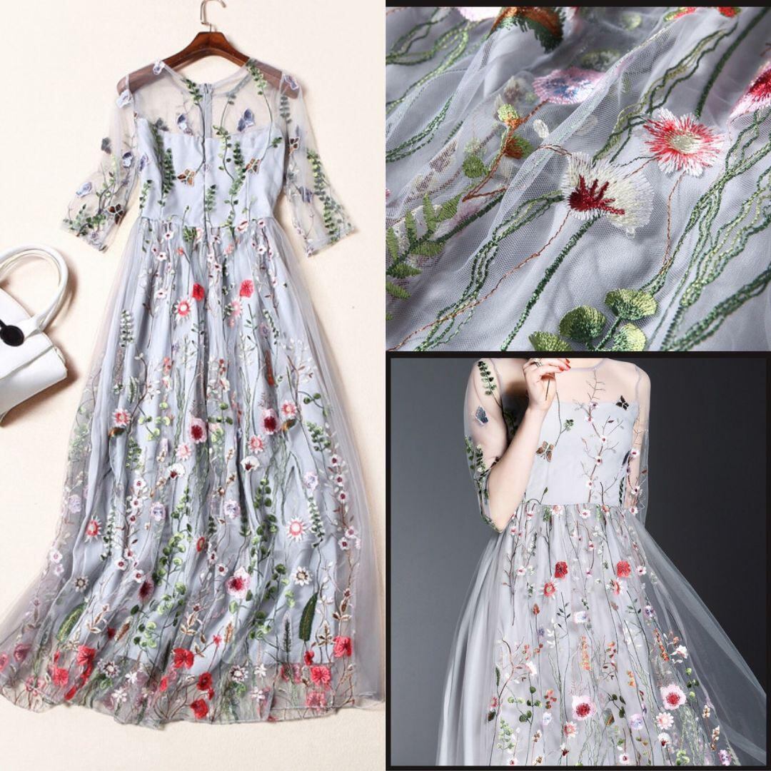 トレンド刺繍花柄チュ-ルワンピ-スです。トレンド感たっぷり色の美しいエレガントなワンピ-スです。デザイン性のあるスタイルがとても魅力的な一着です。可愛いデザインで全体的に優しい感じに仕上げられています。背中ファスナ-有。裏地有。