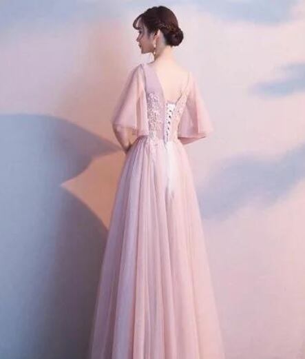 チュール袖フリルのパ-ティ-ロングドレス。ピンクのサテン地の上に同色のチュールを重ねた豪華な仕様。トップス部分は立体刺繍を施し、袖は肩からたっぷりとチュールを使用した広がるデザインで動きやすくなっています。背中はウエスト部分まで編紐掛けなので、バストサイズにゆとりをもって着用いただけます。パーティやイベント、結婚式など、様々なシーンで、気品のある印象を与えてくれる一枚です。裏地有。背中網掛け。腰下ファスナ-有。胸パット付き。
