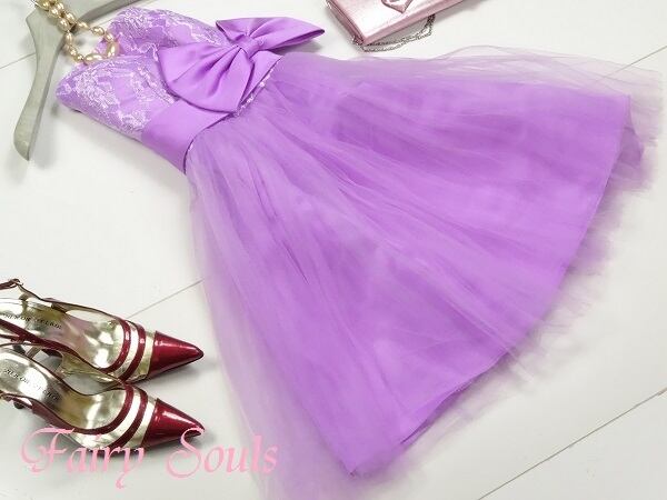 紫のリボンのドレスです。上半身には刺繍があしなわれていて腰の部分の大きなリボンが特徴のとても可愛いドレスです。結婚式や二次会にいかがでしょうか。背中ファスナー。裏地有。