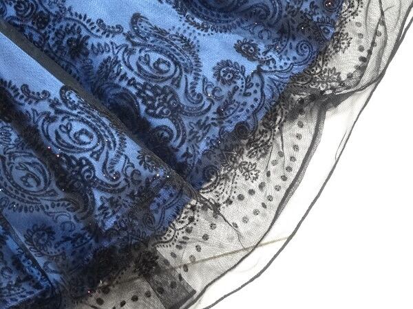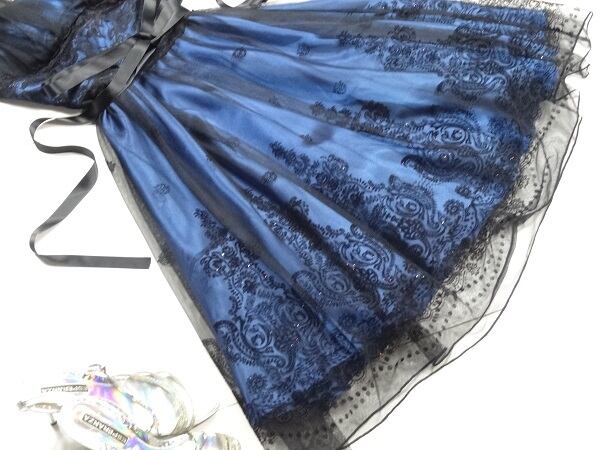 ネットチュールのパーティ-ドレス。鮮やかな深いネイビーのサテン地の上に刺繍をほどこした黒のチュールを重ねています。ベアタイプの胸元から首の後ろを一周するホールドネックの形に肩紐が付いていて、ウエストからのびたチュールのリボンを首の後ろで結ぶデザインです。ウエストにも細い黒のサテンのリボンがついていて背中側で結びアクセントに。胸元がゴム仕様なのでサイズ的にもゆったり着用頂けます。スカート部分は裏地の上にサテン地チュール地が2重についていてしっかりしています。パーティや結婚式の二次会にと、様々なシーンで活躍してくれる一着です。裏地あり。背中ファスナー。胸パット付き。