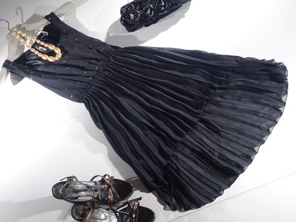 シンプルで綺麗なデザインのプリ-ツワンピ-スです。裾はアシンメトリ-でふんわりとても美しいです。裏地付。バックボタンあり。