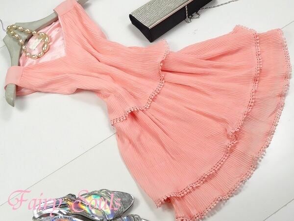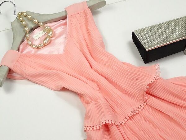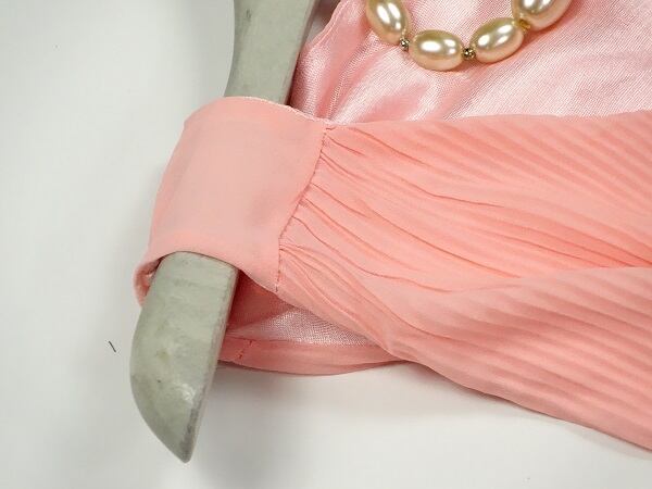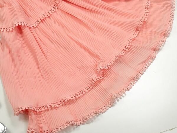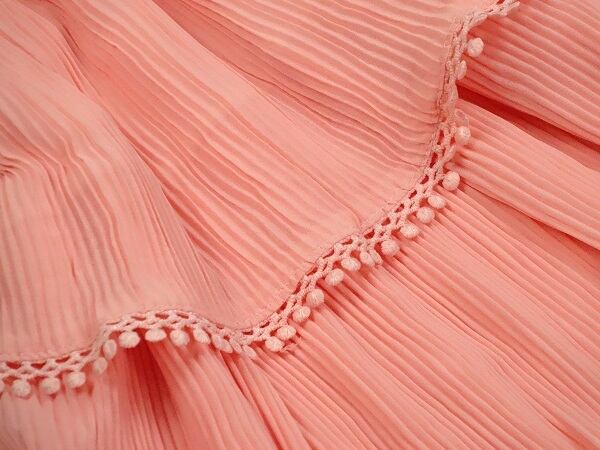 総プリ-ツワンピ-スです。三段フリルになっていてとても可愛いワンピ-スです。ファスナ-なし(かぶるタイプ)。裏地あり。