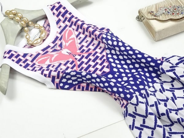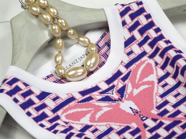 蝶のモチ-フのデザインが印象的でレトロ調のワンピ-スです。ニット素材で伸縮性も抜群です。裏地なし。ファスナ-なし(かぶるタイプ)。