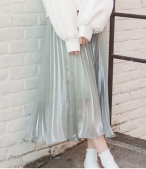 上質光沢モスグリーンサテン調プリーツスカ-ト。光を受けてキラキラ輝く光沢感が美しく、風に優しくなびき、歩くたびに着る人の足元を美しく見せてくれる一着です。ウエストは総ゴムなので、サイズ的に幅があり、ゆったり着用頂けます。裏地付。ファスナーなし。