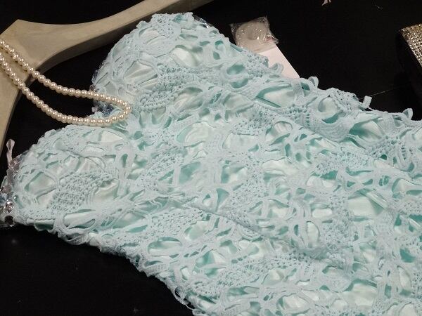 立体刺繍とシフォンのドレス。胸元から腰あたりまでは光沢のあるペパーミントグリーンのサテン地の上に同色の糸で立体刺繍をほどこし、腰から裾までは薄手のシフォン地を使用し軽やかな印象に仕上がっています。上半身は細いキャミソールタイプでデコルテラインを美しく見せ、下半身はしなやかな薄手のシフォンで、太ももあたりまでの短い裏地付きですので透け感があり足のラインが綺麗に見えるデザインになっています。パーティやライブ、イベント、結婚式など、どんなシーンでも活躍してくれる一着です。背中編み紐掛け。左脇下ファスナー。裏地付。胸パッド付。肩紐は長さ調整可能。