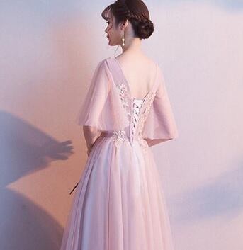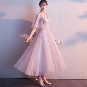 チュール袖フリルのパ-ティ-ロングドレス。ピンクのサテン地の上に同色のチュールを重ねた豪華な仕様。トップス部分は立体刺繍を施し、袖は肩からたっぷりとチュールを使用した広がるデザインで動きやすくなっています。背中はウエスト部分まで編紐掛けなので、バストサイズにゆとりをもって着用いただけます。パーティやイベント、結婚式など、様々なシーンで、気品のある印象を与えてくれる一枚です。裏地有。背中網掛け。腰下ファスナ-有。胸パット付き。