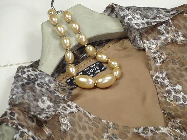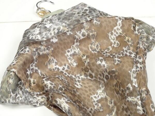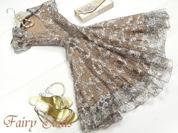ヒョウ柄の美しい模様があしらわれた大変美しいワンピース。裾の透け感が優雅で上品な印象を与えています。どんなシーンでも視線を独り占めしてくれる一枚です。裏地付き。サイドファスナー有。