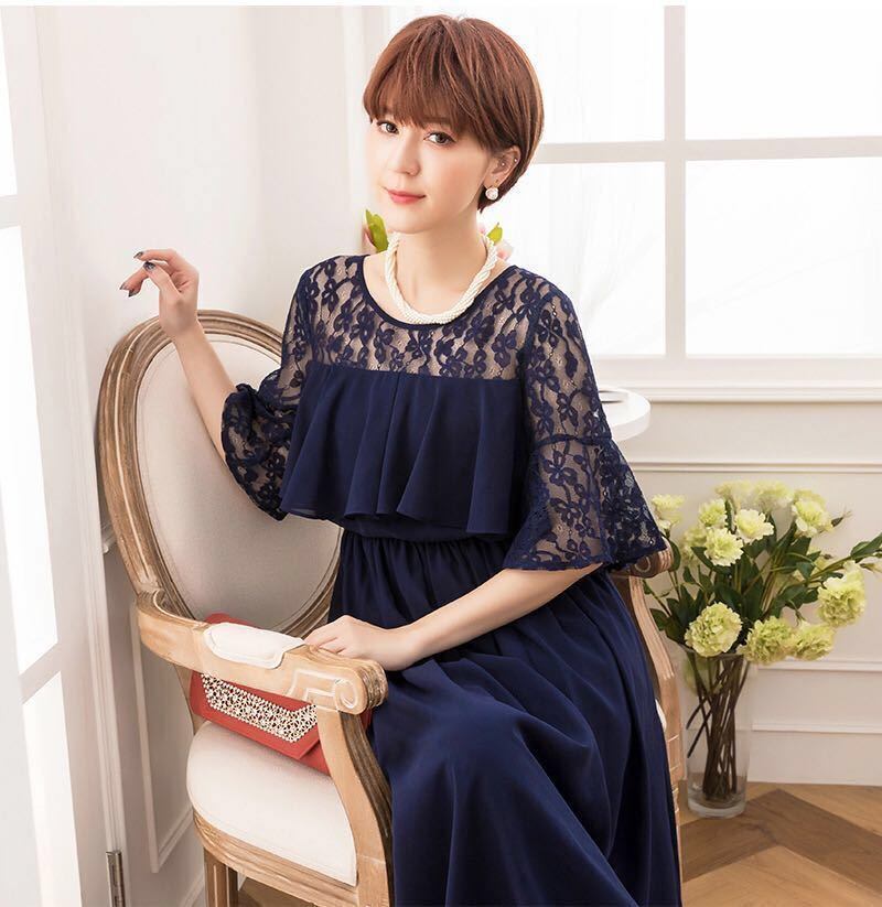 胸元フリルミディアム丈ワンピ-スです。トップス部分のデコルテラインは華やかな模様のレースに、胸元はフリルになっています。ウエストから裾まではやわらかな生地をたっぷりと使用しボリューム感を出しています。気品に満ちたとてもエレガントで上品なひとクラス上をいく一品です。ファスナ-なし(首元うしろ留めボタン1つ有)。