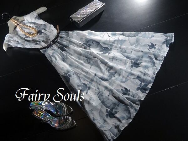 やさしい色合いのロング丈のワンピース。淡い白地に、グレーのグラデーションで描いた大柄な花模様がいっぱいに広がり、ウエストの細い黒のベルトが全体をキュッと引き締めています。しなやかで優雅な一着です。背中ファスナー。ベルト付き。裏地有り。
