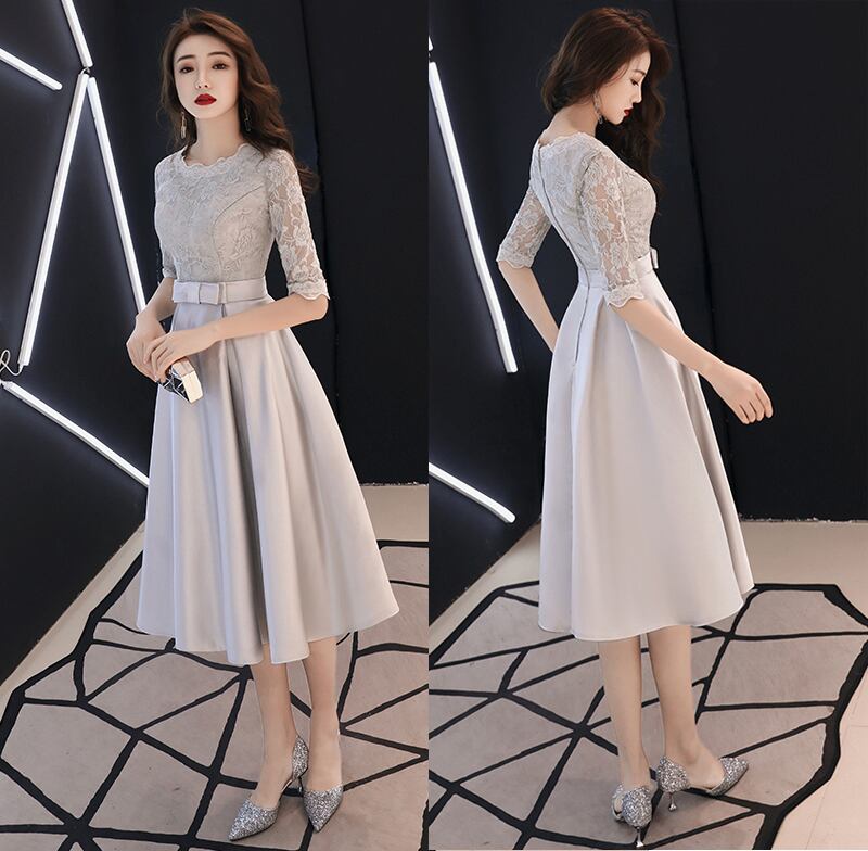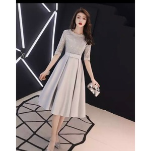 シルバ-の光沢エレガントパ-ティ-ワンピ-スです。気品に満ちたとてもエレガントで上品なひとクラス上をいく一品です。トップス部分のレースの透け感もとても上品でエレガントです。裏地有。背中ファスナ-有。胸パット付き。