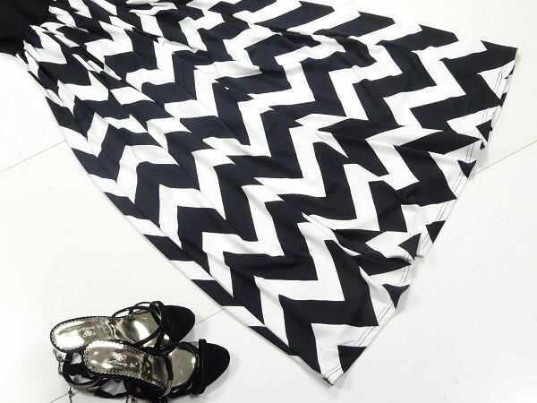 ウエスト切替のマキシ丈ワンピース。トップスは黒一色。スカート部分は白と黒のモノトーン幾何学模様になっています。伸縮性があり軽やかな生地なので着心地は抜群。旅行にも重宝する一着です。ウエストゴム。ファスナーなし。裏地なし。
