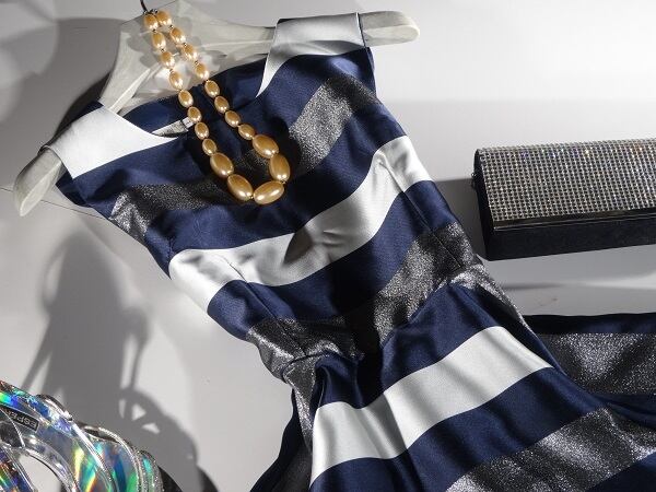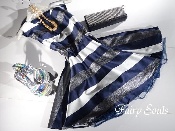 人気のAラインのボーダードレスワンピースです。大人っぽい色合いで結婚式やパーティーにもお薦めの一着です。背中ファスナー有。裏地有。