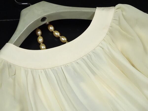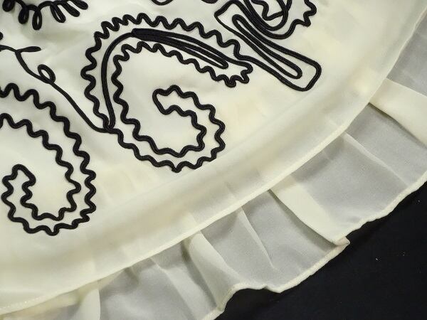 しなやかなソフトベージュ地に黒のコード刺繍が印象的なワンピース。襟元は横に細いタックをいくつもとりエレガントなデザイン。袖は肩からゆったりと広がりフェミニンに。おなか周りから裾にかけて黒のコード刺繍が施された綺麗な一着です。ファスナーなし。裏地有。