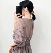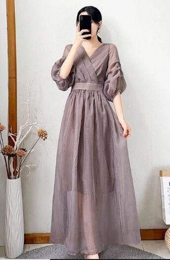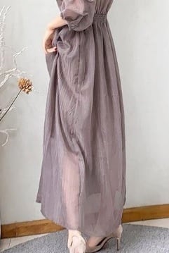胸元カシュクールふるゆわワンピ-ス。伸縮性のあるさらっとしたシュリンク素材の生地を使用。胸元はカシュクール風にあわせ、全体的にふんわりした印象に。袖先できゅっと絞ったふんわりとしたデザインの袖が優しさを演出。裏地は膝丈位までですので、膝下の透け感で足元を美しく見せてくれます。裏地あり。ファスナーなしのかぶるタイプ。