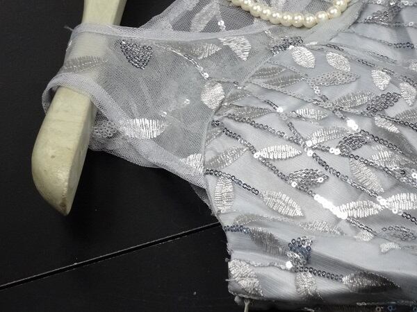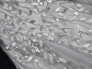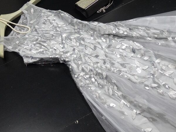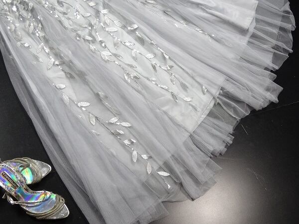 スパンコールと銀糸刺繡のチュールのドレス。シルバーグレーのサテン地の上にスパンコールと銀糸でリーフ刺繍をほどこし、チュールを重ねた豪華なデザイン。胸元はチュールのみで透け感があり、デコルテラインを美しく見せています。ウエストからヒップにかけて少し絞ったマーメイドラインがフェミニンな中に大人のセクシーさをあわせもった魅力的なデザインに仕上げています。パーティやライブ、イベント、結婚式など、どんなシーンでも活躍してくれる一着です。裏地あり。背中ファスナー。胸パット付き。