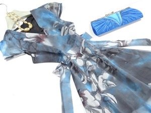 大きな花模様がプリントされたシックなワンピース。裾の後部分が長くなっている不規則な丈の品の良いセクシー感をかもしだしているエレガントな一着です。ウエストを共布のベルトリボンでキュッと絞るデザイン。シックでやさしくエレガントな一着です。裏地有り。背中ファスナー有。布ベルト付。