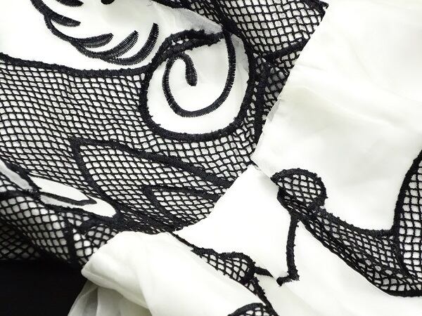 黒の刺繍が印象的なワンピ-ス。つややかな透け感のあるオーガンジー生地に、黒の糸でPOPな模様が刺繍されています。落ち着いた白と黒の色合いから大胆な構図の柄が編み出され、注目度NO.1間違いなし。奇抜な柄にもかかわらず、品の良さを感じさせる、お呼ばれ、デート、コンサート等、どんなシーンでも活躍してくれる貴重な一着です。背中ファスナー。裏地あり。