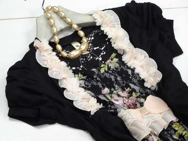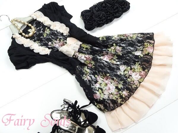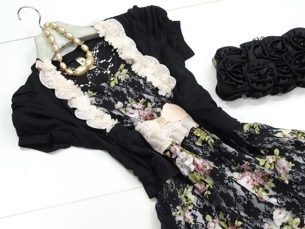 黒地に花模様のレース仕立てのワンピース。クラシックモダンな花柄をメインに、黒のレースを重ね、胸元両サイドには可愛いピンクの立体花モチーフをあしらっています。スカート裾部分にもピンクのシフォンをあしらい、大変可愛い一着です。一部裏地あり。