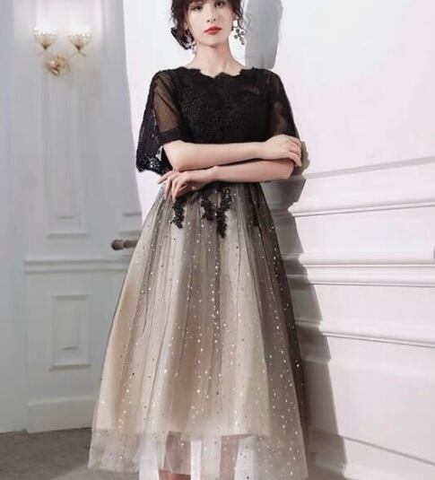 チュールと立体刺繍が施されたレースのシックなドレスです。白のサテン地の上に2枚のチュールをかぶせ、上半身と袖はレース仕様になっています。スカ-ト部分は黒のチュ-ルにシルバ-の星や三日月のビジュ-が施されシックで品があり華やかな、コンサート、ライブ、結婚式の二次会、パーティにとどんなシーンにも活躍してくれる一着です。裏地あり。背中網掛け。腰下ファスナ-有。胸パット付き。
