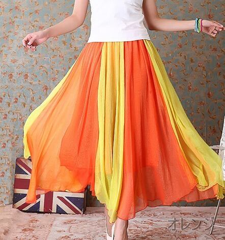 やさしいパステルカラーのグラデーションが美しいマキシ丈のスカート。軽やかで柔らかいシフォンが動くたびに足元を美しく魅せてくれます。ウエストは総ゴムでサイズ的にゆとりを持って着用頂けます。また、ウエストを胸もとにもってくると、ベアタイプのワンピースとしても楽しんで頂けるお得なデザイン。普段着はもちろん、リゾートやライブ、パーティにと様々なシーンで活用頂ける一着です。裏地あり。紐ベルト付。