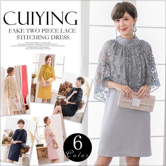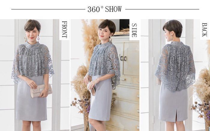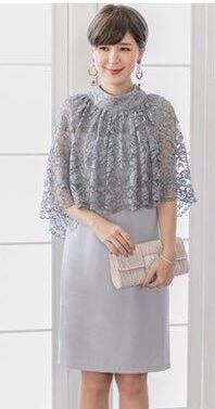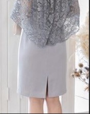 トップス部分レ-ス重ね膝丈ワンピ-スです。トップス部分がグレ-の下地に同色のレ-スが重ねられとてもエレガントな大人の雰囲気を醸し出してくれるワンピ-スです。後ろスカ-ト部分の裾中央にスリットが有ります。裏地有。背中ファスナ-有。