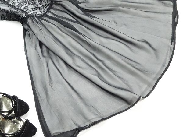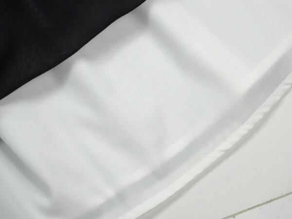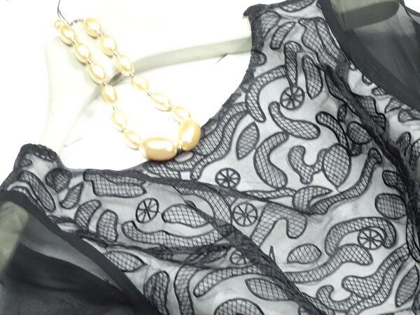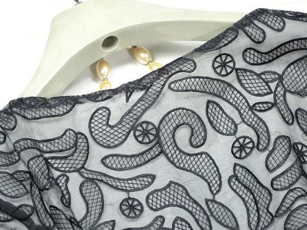 黒と白の生地の重ねがとても美しく大人の気品漂う刺繍がオシャレでしぐさを優雅に見せてくれる贅沢なワンピ-スです。女優スタイルの中に品の良さがバランスよく組み込まれた魅力的なデザインです。左脇ファスナー有。裏地あり。