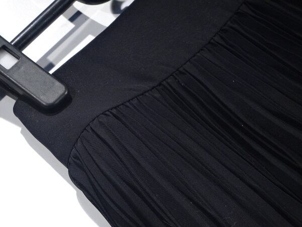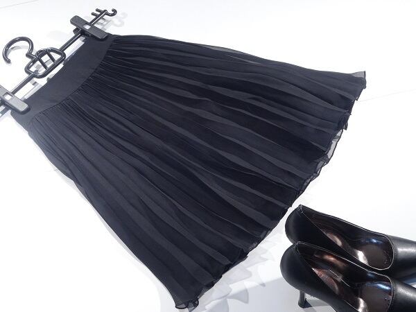 プリーツが上品な膝丈スカートです。風に優しくなびき、歩くたびに着る人の足に目がいく一着です。裏地有。左サイド