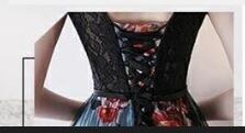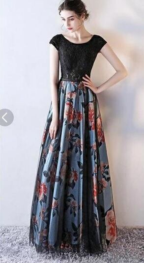 レース切替サテンチュールのロングドレス。気品に満ちたとてもエレガントで上品なひとクラス上をいく一品です。トップス部分は黒の花柄レース。ウエストから裾にかけてはクラシカルな花模様のプリントが施された灰青のサテン地の上にチュールを重ねた華かつ上品でエレガントなデザインになっています。パーティやコンサート、結婚式の二次会にと、様々な華やかなシーンで活躍してくれる一着です。背中は網紐掛けなので、紐の締め具合を調整することでサイズに余裕をもって着用いただけます。裏地有。胸パット付き。