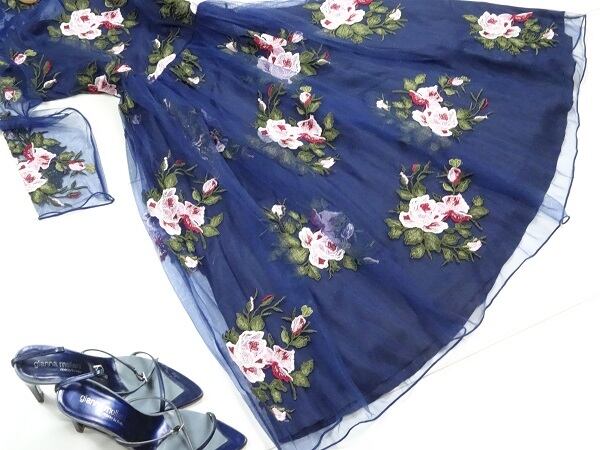 デコルテラインと袖の透け感が魅力的なワンピース。落ち着いたネイビーの生地に鮮やかな糸で花を刺繍。胸元と袖がシースルーになっているので、シックでいて華やかな印象になっています。脇下ファスナ-。裏地有り。